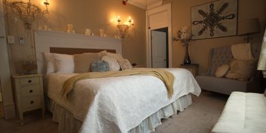 This more romantic King room features chandelier sconces, dreamy creams colors and a claw foot bathtub.